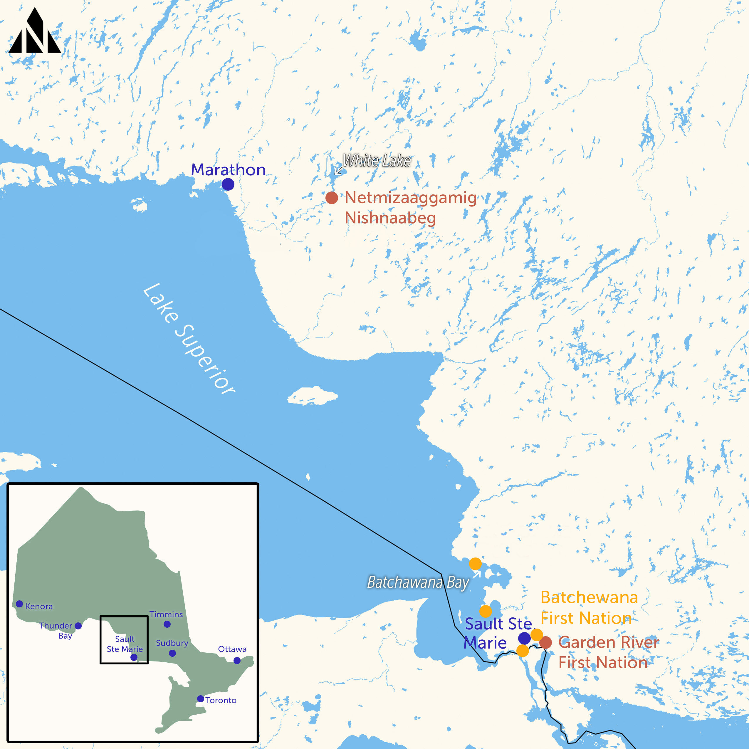 Netmizaaggamig Nishnaabeg is located on White Lake. Garden River and Batchewana First Nations are centred a few hours’ drive away near Sault Ste. Marie, Ont., but have said their traditional territories extend northwest along the Lake Superior shoreline. (Map Credit: Shawn Parkinson and Andrew Munroe/The Narwhal)