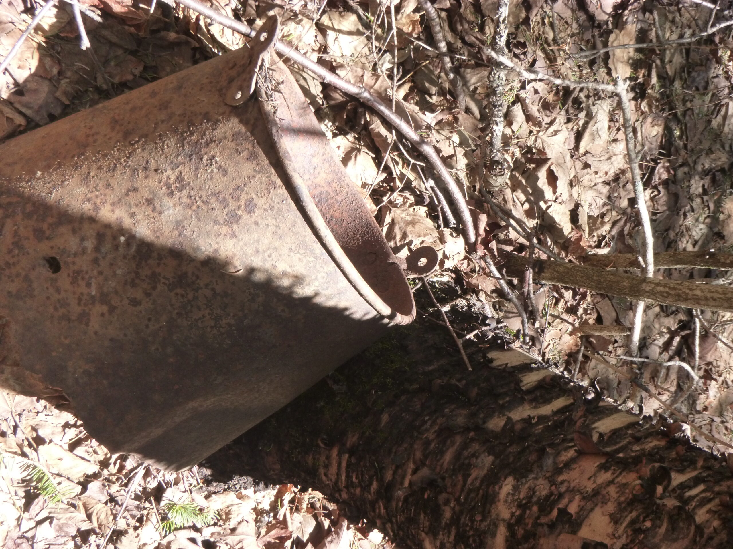 Sap collecting bucket at the old Drouillard/Anakwad sugarbush. (Photo Credit: Staci Drouillard)