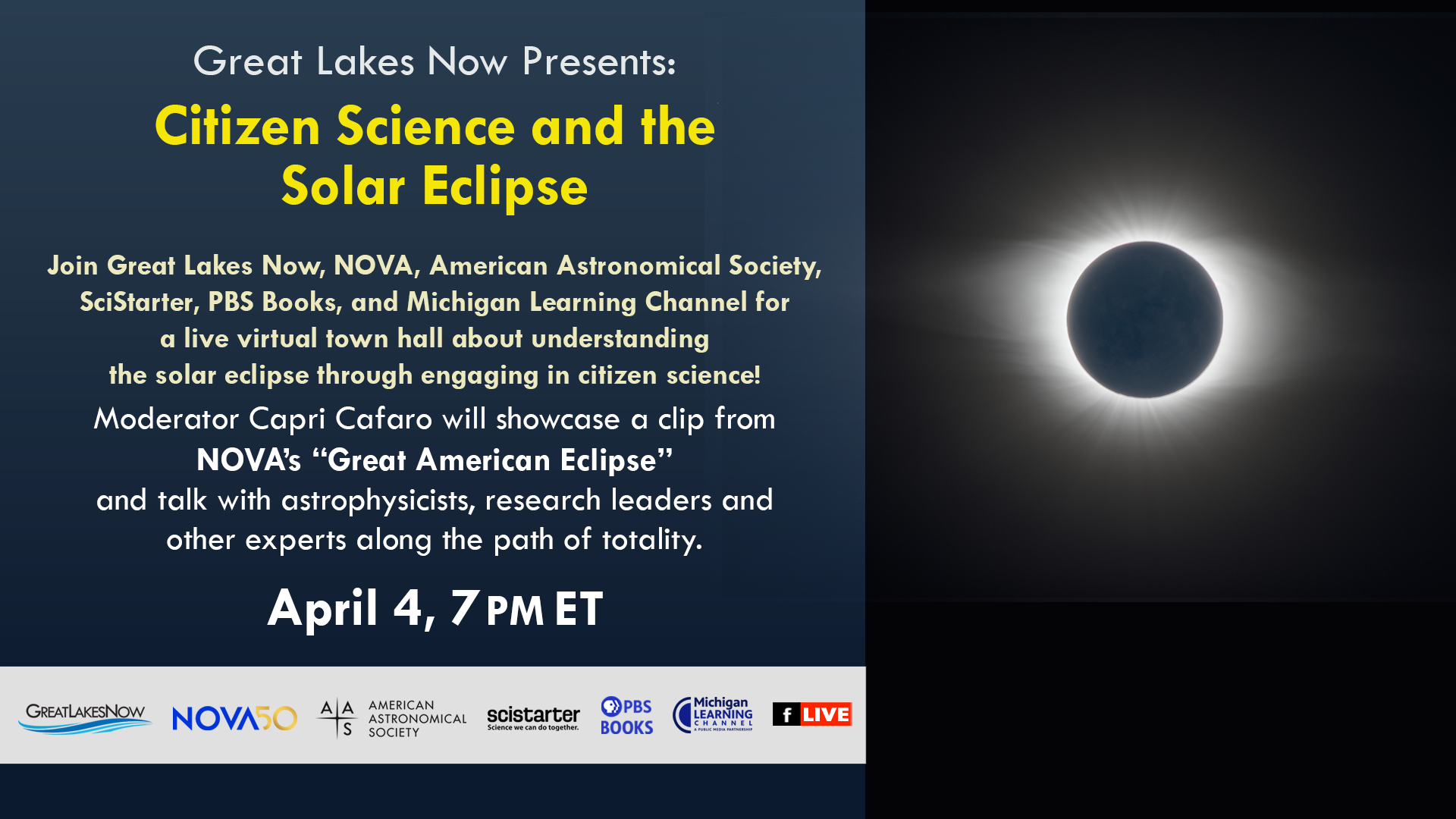Join Great Lakes Now, NOVA, SciStarter, the American Astronomical Society, Michigan Learning Channel and PBS Books as we dig into the science of the solar eclipse with astrophysicists from NASA. We’ll get the details on eclipse citizen science initiatives, and watch a clip from NOVA’s “Great American Eclipse” special too! Great Lakes Now Contributor Capri Cafaro will moderate this educational and engaging discussion, and we’ll take your questions and comments for our panel of experts during this LIVE town hall event.