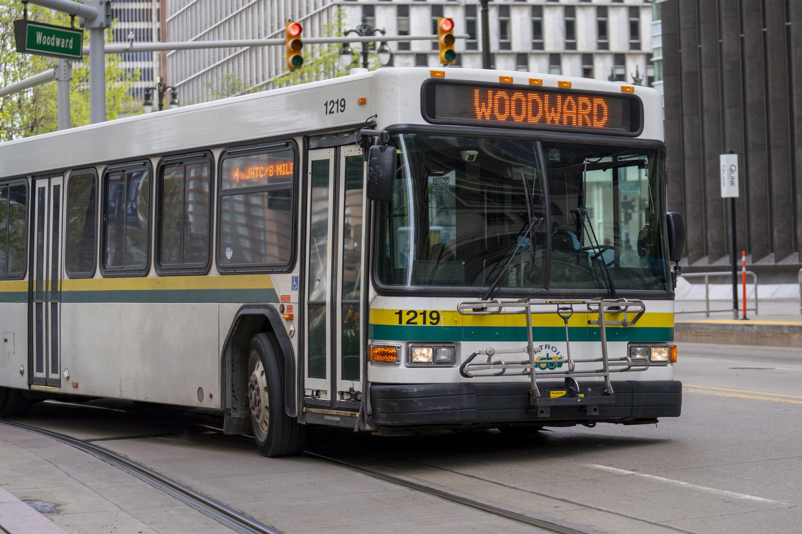 A public bus operated by the Detroit Department of Transportation (DDOT) drives passengers down Woodward Avenue on Wed. May 7, 2025. (Photo Credit: Donté Smith/Great Lakes Now)